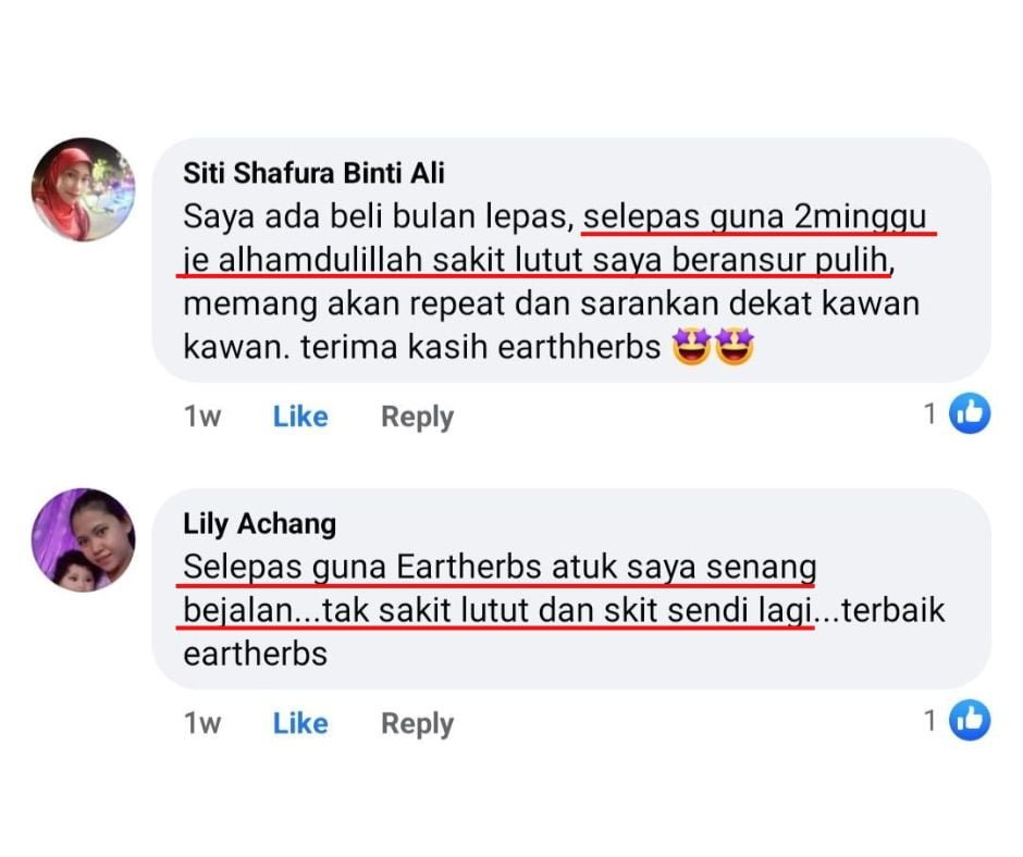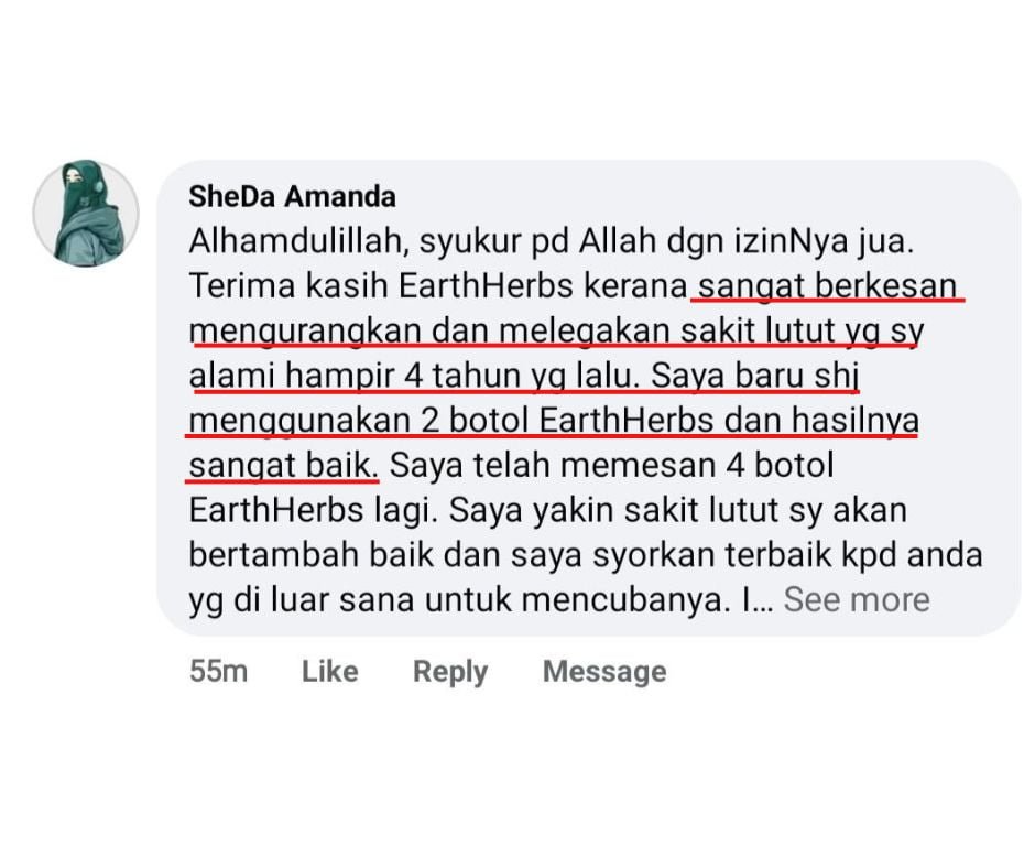 “Baru guna sebotol EARTHHERBS ni sekarang dah boleh jalan jauh sakit sendi dah kurang”