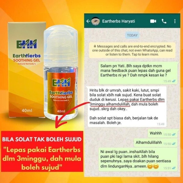 “Alhamdulillah sekarang dah boleh solat berdiri macam biasa selepas amalkan Gel EARTHHERBS ni..”