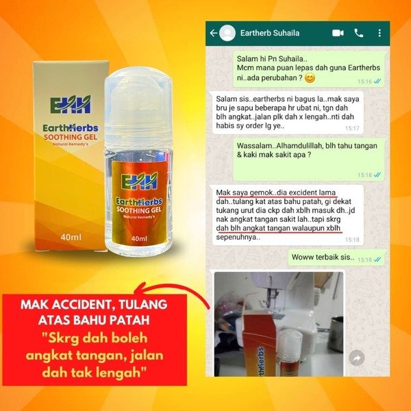 “Alhamdulillah selepas saya bagi mak amalkan Gel EARTHHERBS sekarang dah boleh angkat tangan dan dah tak ada masalah lenguh-lenguh lagi dah”